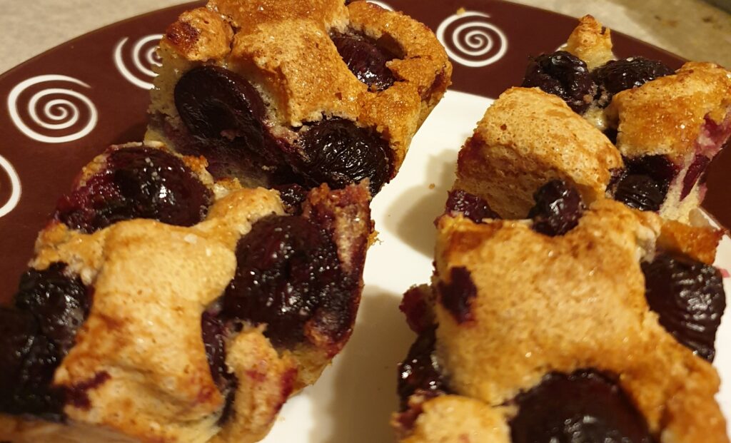- Se pune asta în tavă, se nivelează, se presară deasupra zahăr, se presară cireșe, vișine, ce ai, fără sâmburi, se mai presară un pic de zahăr și țuști la cuptor 180° 35-40 min (depinde de cuptor, verifici cu scobitoarea).